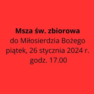 Msza Święta zbiorowa do Miłosierdzia Bożego odbędzie się w piątek 26 stycznia o godz. 17.00. Zapraszamy!